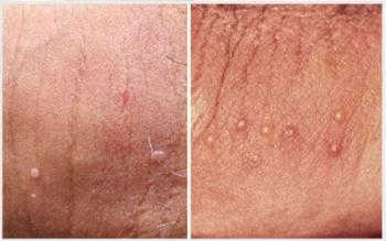 Thân dương vật sẽ xuất hiện các nốt mụn mọc đơn lẻ, u nhú nhô cao có màu hồng nhạt, không ngứa ngáy, đau hay khó chịu nào.