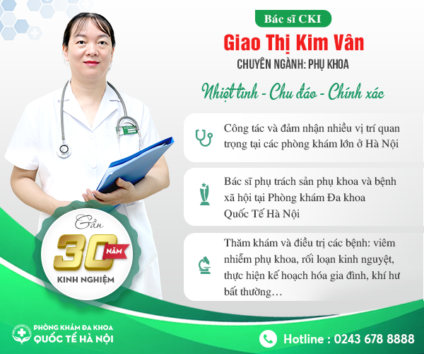 • Bác sĩ CKI Sản phụ khoa Giao Thị Kim Vân với hơn 20 năm kinh nghiệm, về khám phụ khoa, khám thai, đình chỉ thai, tư vấn kế hoạch hóa gia đình, hỗ trợ điều trị bệnh phụ khoa, bệnh xã hội cho nữ giới.