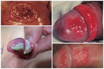 Dương vật, quy đầu, bao quy đầu mọc mụn, lộn bao quy đầu có mảng bám màu trắng mùi hôi khó chịu.
