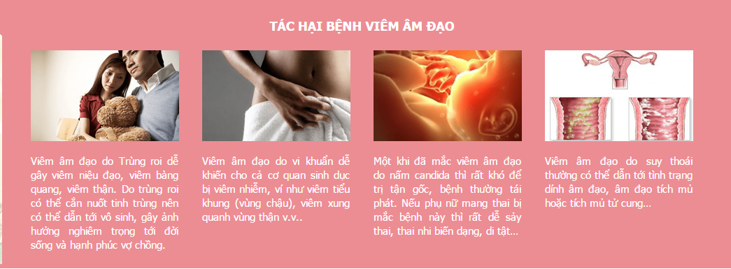 • Ảnh hưởng thai nhi:Trong thời gian mang thai mà thai phụ mắc viêm âm đạo không được điều trị kịp thời sẽ gây ảnh hưởng đến sự phát triển của thai nhi. Thậm chí có thể lây nhiễm cho con khi sinh thường, do da và niêm mạc bé tiếp xúc với dịch âm đạo chứa vi khuẩn, nấm gây bệnh, ảnh hưởng sức khỏe bé sau khi chào đời.Đăng ký tư vấn miễn phí: [TẠI ĐÂY]!